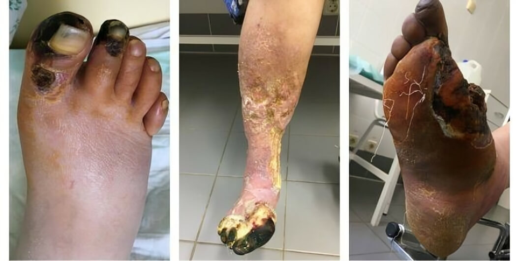 Maschio, 33 anni. Neuropatia diabetica e danno nervoso critico causato dal glucosio. Inizialmente ulcera cutanea superficiale, ma dopo 2 mesi si è manifestata una profonda ferita trofica con necrosi progressiva.